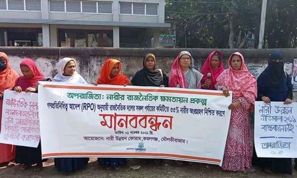 গণপ্রতিনিধিত্ব আদেশ (RPO) অনুযায়ী বিভিন্ন রাজনৈতিক দলের সh পর্যায়ের কমিটিতে শতকরা ৩৩ ভাগ নারীদের অন্তর্ভূক্ত করার দাবিতে মৌলভীবাজারের কমলগঞ্জে মানববন্ধন অনুষ্ঠিত হয়েছে।