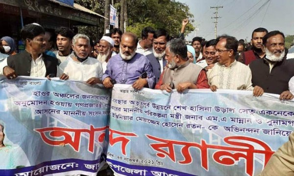 জামালগঞ্জে নেত্রকোণা থেকে সুনামগঞ্জের যোগাযোগ ব্যবস্থার পরিবর্তন ঘটাতে উড়াল সেতু প্রকল্প একনেকে অনুমোদন হওয়ায় প্রধানমন্ত্রী শেখ হাসিনা, পরিকল্পনা মন্ত্রী এমএ মান্নান, স্থানীয় সরকার মন্ত্রী তাজুল ইসলাম ও স্থানীয় সংসদ সদস্য ইঞ্জিনিয়ার মোয়াজ্জেম হোসেন রতনকে অভিনন্দন জানিয়ে আনন্দ মিছিল অনুষ্ঠিত হয়েছে।
