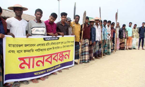 রাতারগুলের জলারবন এলাকায় নৌকার প্রবেশ মূল্য মওকুফের দাবিতে মানববন্ধন করেছে গ্রামবাসী ও মাঝিরা। আজ শুক্রবার (১০ ডিসেম্বর) দুপুরে জলারবন নৌকারঘাটে এ মানববন্ধন হয়।