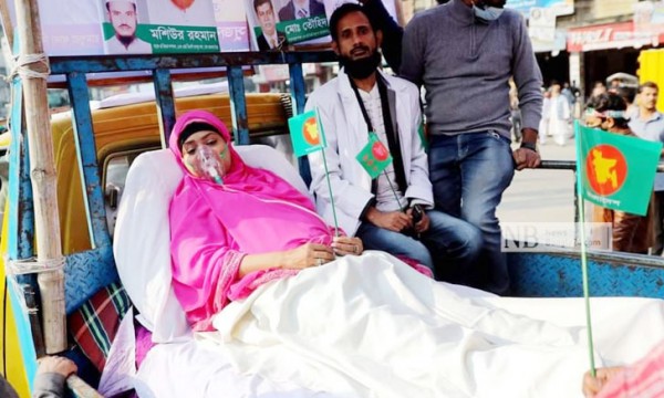 একটি ট্রাকের ওপরে সাদা চাদরে মোড়ানো বিছানা। এর ওপরে গোলাপি রঙের জামা পরা ‘খালেদা জিয়া’ মুখে অক্সিজেন মাস্ক পরে শুয়ে আছেন। হাতে বাংলাদেশের পতাকা। তার ঠিক পাশেই অ্যাপ্রোন পরে বসে আছেন এক ‘চিকিৎসক’।