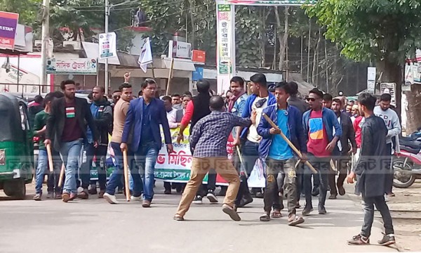 অন্যদিকে মিছিলটি প্রতিহত করতে শহরের ষাটমা স্কুলের সামনে যুবদলের অপর একটি গ্রুপের নেতাকর্মীরা অবস্থান নেন। খবর পেয়ে পুলিশ সংঘর্ষ এড়াতে ঘটনাস্থলে পৌঁছে লাঠিচার্জ করে উভয় গ্রুপকে ছত্রভঙ করে দেয়। এ সময় উপজেলা যুবদলের আহ্বায়ক এসএম শরিফুল ইসলাম বাবলুর গ্রুপের নেতাকর্মীরা পুলিশকে লক্ষ্য করে ঢিল ছুঁড়ে মারে। পরে পুলিশ তাদের ধাওয়া করে ছত্রভঙ করে দেয়।
