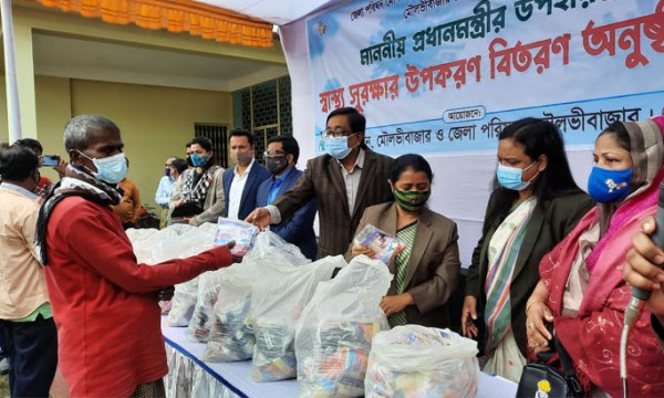 মৌলভীবাজারে করোনা ভাইরাসের নতুন ধরন ওমিক্রন মোকাবিলায় মৌলভীবাজার জেলার জনসাধারণের জন্য প্রধানমন্ত্রীর উপহারস্বরূপ স্বাস্থ্য সুরক্ষার উপকরণ বিতরণ করা হয়েছে।