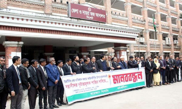 বৃহস্পতিবার (৩ ফেব্রুয়ারি) দুপুরে সিলেট জেলা ও দায়রা জজ আদালতের সামনে দুই শতাধিক আইনজীবীর উপস্থিতিতে এই মানববন্ধন ও সমাবেশ অনুষ্ঠিত হয়।