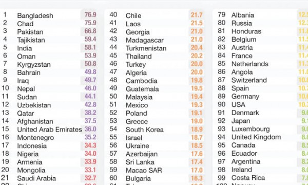বাংলাদেশের পরই এই তালিকায় আছে আফ্রিকার দেশ চাদ; এই দেশটি প্রথমবারের মতো আইকিউএয়ারের তালিকায় স্থান পেয়েছে। এছাড়া পাকিস্তান (তৃতীয়), তাজিকিস্তান (চতুর্থ), ভারত (পঞ্চম) এবং ওমান ষষ্ঠ স্থানে আছে।