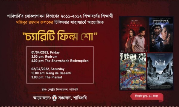 এর মধ্যে শুক্রবার (১ এপ্রিল) বিকেল ৩টায় Redrum, সন্ধ্যা ৬টায় The Shawshank Redemption, পরের দিন শনিবার (২ এপ্রিল) সকাল ১০টায় Rang De Basanti, বিকাল ৩টায় The Pianist প্রদর্শন করা হবে। প্রতিটি শো' তে টিকিটের শুভেচ্ছা মূল্য রাখা হয়েছে ৪০ টাকা।