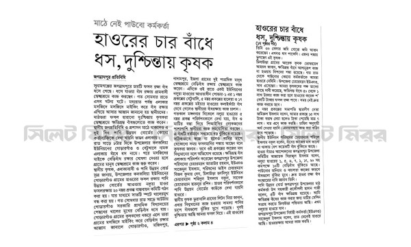 সুনামগঞ্জের জগন্নাথপুরে চারটি ফসল রক্ষা বাঁধ ধসে গেছে। ধসে যাওয়া বাঁধ রক্ষায় গ্রামবাসী স্বেচ্ছাশ্রমে কাজ করছেন। গত সোমবার রাতে এসব ঘটনা ঘটে।