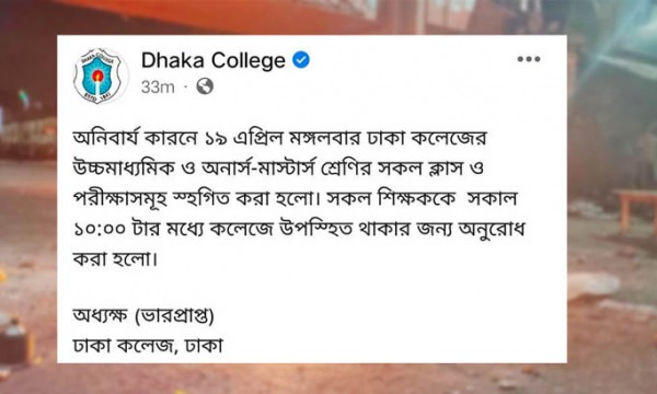 ঢাকা কলেজের ভারপ্রাপ্ত অধ্যক্ষের নির্দেশনায় দেওয়া ওই ঘোষণায় উল্লেখ করা হয়, ‘অনিবার্য কারণে ১৯ এপ্রিল, মঙ্গলবার ঢাকা কলেজের উচ্চমাধ্যমিক ও অনার্স-মাস্টার্স শ্রেণির সকল ক্লাস ও পরীক্ষাসমূহ স্থগিত করা হলো। সকল শিক্ষককে সকাল ১০টার মধ্যে কলেজে উপস্থিত থাকার জন্য অনুরোধ করা হলো।’