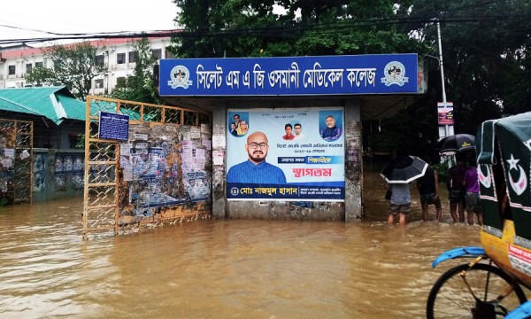 দিনভর ভারী বৃষ্টিপাত ও উজান থেকে নামা ঢলে প্লাবিত হয়েছে সিলেট নগরের অলিগলি। দুপুরের দিকে বন্যার পানিতে তলিয়ে গেছে সিলেট এম এ জি ওসমানী মেডিকেল কলেজ হাসপাতালও। এতে চরম দুর্ভোগে পড়েন রোগীরা।