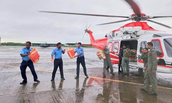 সিলেটে স্মরণকালের ভয়াবহ বন্যা পরিস্থিতি মোকাবেলায় বাংলাদেশ বিমান বাহিনী পর্যবেক্ষণ, ত্রাণ বিতরণ ও উদ্ধার কার্যক্রম অব্যাহত রেখেছে। রবিবার (১৯ জুন) বাংলাদেশ বিমান বাহিনীর একটি এডব্লিউ-১৩৯ সার্চ এন্ড রেসকিউ হেলিকপ্টারের মাধ্যমে সুনামগঞ্জের জামালগঞ্জ, সুনামগঞ্জ সদর, তাহেরপুর এবং দিরাই এলাকার পানিবন্দী লোকজনের মধ্যে ত্রাণ বিতরণে সহায়তা করে।