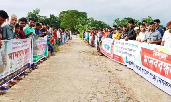 মানববন্ধনে বক্তারা বলেন, জেলা শহর সুনামগঞ্জ, বিভাগীয় শহর সিলেট ও রাজধানী ঢাকাসহ দেশের বিভিন্ন এলাকায় নরসিংপুর ইউনিয়নবাসীর যাতায়াতের একমাত্র ভরসা নরসিংপুর-নোয়ারাই সড়কটি। কিন্তু বিধি ভাম! ভাগ্যের নির্মম পরিহাস! বর্তমান ডিজিটাল যুগে দেশব্যাপী যোগাযোগক্ষেত্রে ব্যাপক উন্নয়ন হলেও এক্ষেত্রে আমরা রয়েছি অনেক পিছিয়ে।