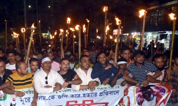 ভোলা জেলা ছাত্রদলের সভাপতি নুরে আলমকে পুলিশ পরিকল্পিতভাবে গুলি করে হত্যা করেছে অভিযোগ করে তার প্রতিবাদে সিলেট নগরে মশাল মিছিল করেছে সিলেট জেলা ও মহানগর ছাত্রদল।
