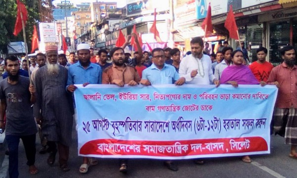 বাম গণতান্ত্রিক জোটের ডাকা আগামী ২৫ আগস্টের অর্ধদিবস হরতালের সমর্থনে নগরে বিক্ষোভ মিছিল ও সমাবেশ করেছে বাংলাদেশের সমাজতান্ত্রিক দল-বাসদ সিলেট জেলা শাখা। শুক্রবার (১৯আগস্ট) বিকাল পাঁচটায় নগরের আম্বরখানায় দলীয় কার্যালয়ের সামনে থেকে মিছিল শুরু হয়ে গুরুত্বপূর্ণ সড়ক প্রদক্ষিণ করে শহীদ মিনারের সামনে সমাবেশে মিলিত হয়।