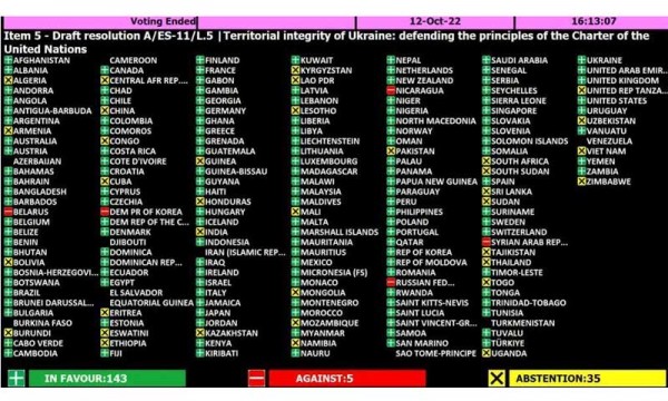 ইউক্রেনের চারটি অঞ্চলকে রুশ ফেডারেশনে যুক্ত করার বিষয়ে জাতিসংঘের সাধারণ পরিষদে একটি নিন্দা প্রস্তাব পাস হয়েছে। এতে বাংলাদেশসহ ১৪৩টি দেশ রাশিয়ার বিপক্ষে ভোট দিয়েছে।
