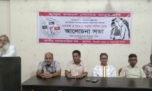 `মানবতা ও সাম্যের সংগ্রাম শাণিত হোক'-এ ডাকে জাতীয় সমাজতান্ত্রিক দল-জাসদ সিলেট জেলা ও মহানগর শাখার উদ্যোগে আজ সোমবার সন্ধ্যা ছয়টায় জিন্দাবাজারস্থ নজরুল একাডেমী মিলনায়তনে আলোচনা সভা অনুষ্ঠিত হয়েছে।