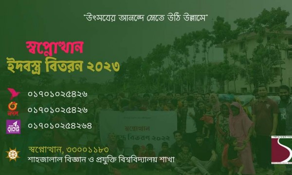 সুবিধাবঞ্চিত মানুষের মুখে হাসি ফোটাতে ঈদবস্ত্র বিতরণ কর্মসূচি হাতে নিয়েছে শাহজালাল বিজ্ঞান ও প্রযুক্তি বিশ্ববিদ্যালয়ের (শাবিপ্রবি) অন্যতম স্বেচ্ছাসেবী সংগঠন 'স্বপ্নোত্থান'।