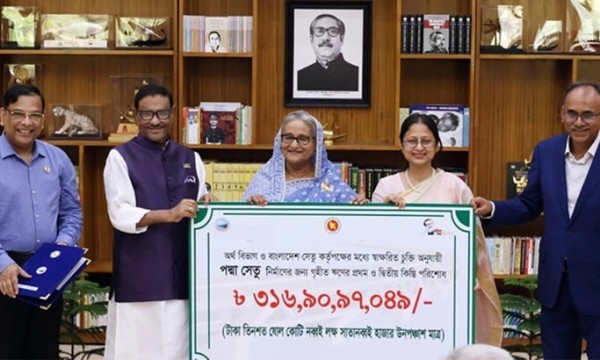 সড়ক পরিবহন ও সেতুমন্ত্রী ওবায়দুল কাদের প্রধানমন্ত্রীর সরকারি বাসভবন গণভবনে পদ্মা সেতু নির্মাণের ঋণ পরিশোধের প্রথম কিস্তি হিসেবে প্রায় ৩১৬ কোটি ৯১ লাখ টাকার চেক হস্তান্তর করেন।