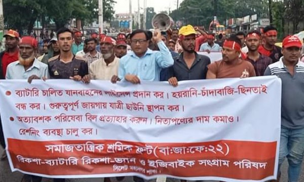 অত্যাবশক পরিষেবা বিল প্রত্যাহার,ব্যাটারি চালিত যানবাহনের লাইসেন্স প্রদান-হয়রানির-চাঁদাবাজি বন্ধ, নিত্যপণ্যের দাম কমানো, নগরের গুরুত্বপূর্ণ স্থানগুলোতে যাত্রী ছাউনি নির্মাণের দাবিতে নগরে বিক্ষোভ মিছিল ও সমাবেশ করেছে সমাজতান্ত্রিক শ্রমিক ফ্রন্ট এবং রিকশা-ব্যাটারি রিকশা-ভ্যান ও ইজিবাইক সংগ্রাম পরিষদ সিলেট মহানগর শাখা ।