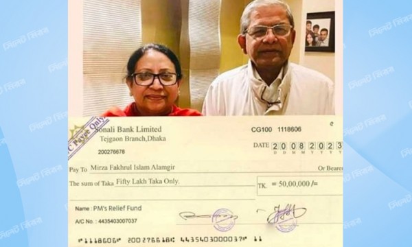 যোগাযোগমাধ্যমে ছড়িয়ে পড়া ছবিতে দেখা যাচ্ছে, বিএনপি মহাসচিব মির্জা ফখরুল ইসলাম আলমগীরের নামে প্রধানমন্ত্রীর ত্রাণ তহবিল থেকে ৫০ লাখ টাকার চেক ইস্যু করা হয়েছে। মির্জা ফখরুল ও তার স্ত্রীর ছবি দিয়ে দাবি করা হচ্ছে, প্রধানমন্ত্রীর ত্রাণ তহবিল থেকে চিকিৎসা সহায়তা নিয়ে বিদেশ ভ্রমণে মির্জা ফখরুল ইসলাম আলমগীর।