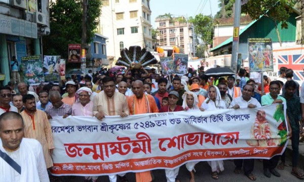 আজ বুধবার (৬ সেপ্টেম্বর) শ্রী শ্রী রাধা মাধব জিউ মন্দির, আন্তর্জাতিক কৃষ্ণভাবনামৃত সংঘ (ইসকন) আয়োজিত ভগবান শ্রীকৃষ্ণের জন্মাষ্ঠমী উপলক্ষ্যে বর্ণাঢ্য নগর পরিক্রমা উদ্বোধন শেষে শ্রী শ্রী বলরাম জিউর আখড়ায় শ্রীকৃষ্ণ-ভক্তবৃন্দ সম্মিলিত জন্মষ্ঠমী উদ্যাপন পরিষদ সিলেট আয়োজিত শোভাযাত্রায় অংশগ্রহণ করেন।