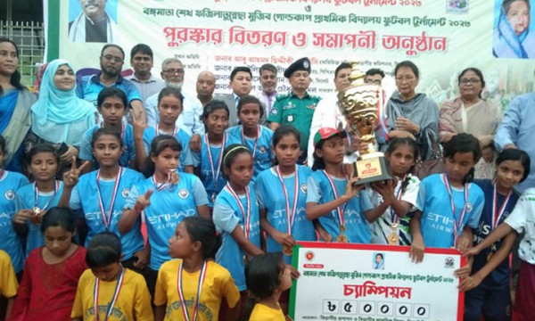 ‘বঙ্গবন্ধু গোল্ডকাপ প্রাথমিক বিদ্যালয় ফুটবল টুর্নামেন্ট ও বঙ্গমাতা শেখ ফজিলাতুন্নেছা মুজিব গোল্ডকাপ প্রাথমিক বিদ্যালয় ফুটবল টুর্নামেন্ট-২০২৩’, সিলেট বিভাগীয় পর্যায়ের দুটি টুর্নামেন্টের ফাইনাল ও পুরস্কার বিতরণ অনুষ্ঠিত হয়েছে বুধবার। সিলেট বিভাগীয় প্রশাসন ও সিলেট বিভাগীয় প্রাথমিক শিক্ষা অধিদপ্তরের আয়োজনে সিলেট নগরের রিকাবী বাজারস্থ সিলেট জেলা স্টেডিয়ামে এই টুর্নামেন্ট দুটি সম্পন্ন হয়।