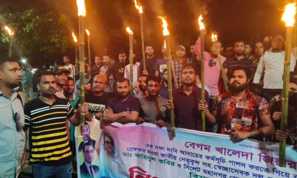 বিএনপির চেয়ারপারসন খালেদা জিয়া, মহাসচিব মির্জা ফখরুল ইসলাম আলমগীরসহ বিএনপির নেতৃবৃন্দের মুক্তি ও সরকার পতনের এক দফা দাবিতে বিএনপির ডাক বুধ ও বৃহস্পতিবারের হরতালের সমর্থনে নগরে মশাল মিছি করেছে সিলেট মহানগর স্বেচ্ছাসেবক দল।