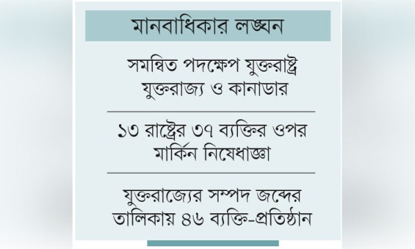 বিশ্বজুড়ে মানবাধিকার লঙ্ঘনের দায়ে জড়িত ৯৬ ব্যক্তি ও প্রতিষ্ঠানের বিরুদ্ধে সমন্বিত নিষেধাজ্ঞা দিয়েছে যুক্তরাষ্ট্র, যুক্তরাজ্য ও কানাডা। এর মধ্যে ১৩ দেশের ৩৭ ব্যক্তি বাইডেন প্রশাসনের নিষেধাজ্ঞার আওতায় এসেছে। যুক্তরাজ্য সরকার ৪৬ ব্যক্তি-প্রতিষ্ঠানের সম্পদ জব্দ করবে। এ ছাড়া মিয়ানমারের জান্তাপ্রধানসহ ১৩ ব্যক্তির বিরুদ্ধে বিধিনিষেধ আরোপ করেছে কানাডা সরকার।