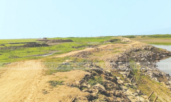 হালির হাওরের ঘনিয়ার বিল সংলগ্ন ক্লোজার। উচ্চ ঝুঁকিতে থাকা এ ক্লোজারের হাওরের ভেতরের অংশে সামান্য মাটি পড়েছে। নদী সংলগ্ন স্থানে এখনও মাটি পড়েনি। ছবি গত শুক্রবারের।