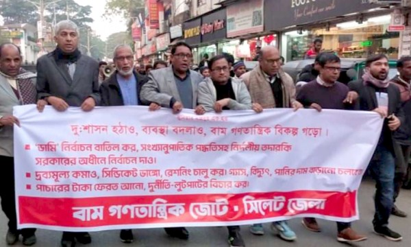 ‘ডামি’ নির্বাচন বাতিল, সংখ্যানুপাতিক পদ্ধতি প্রবর্তনসহ নির্বাচন ব্যবস্থার সংস্কার এবং নির্দলীয় তদারকি সরকারের অধীনে নির্বাচন, দ্রব্যমূল্য কমানোসহ নানা দাবিতে সিলেটে বিক্ষোভ মিছিল ও সমাবেশ করেছে বাম গণতান্ত্রিক জোট সিলেট জেলা শাখা।