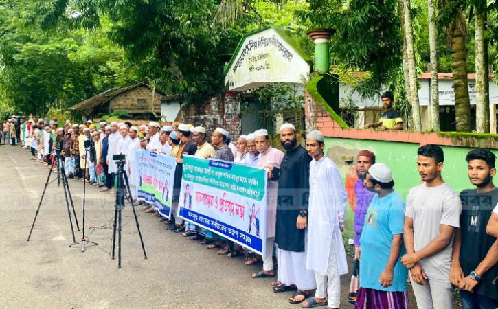 শুক্রবার (২৮ জুন) জুম্মার নামাজের পর মুসল্লিরা মনসুর মোহাম্মদিয়া সিনিয়র মাদরাসার সামনে বিক্ষোভ ও মানববন্ধন কমসূচি পালন করে । এ সময় গ্রামের সাধারণ মানুষ ও মসজিদের মুসল্লীরা মানববন্ধনে যোগ দেয় ।