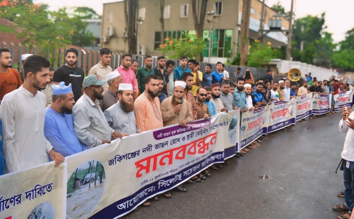 শনিবার (৬ জুলাই) বিকাল ৪টায় সিলেট কেন্দ্রীয় শহীদ মিনারের সামনে এ মানববন্ধন অনুষ্ঠিত হয়। তীব্র বৃষ্টি উপেক্ষা করে মানববন্ধনে অংশ নেন শতাধিক মানুষ।