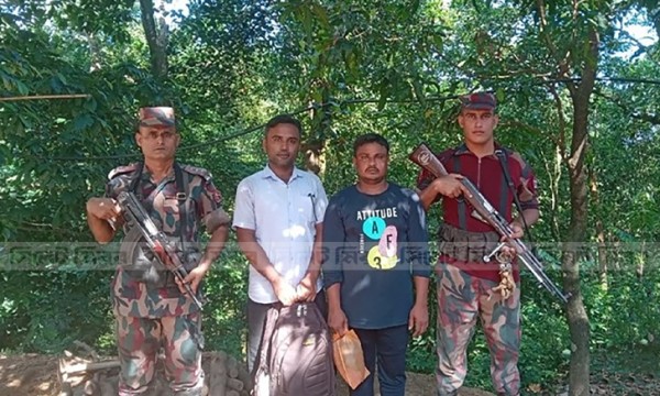 বিজিবি ও স্থানীয় সূত্রে জানা গেছে, শুক্রবার দুপুর ২টার দিকে দনা সীমান্ত এলাকায় বিজিবির সোনারখেওর বিওপির নেতৃত্বে বিশেষ দল টহলের সময় দুই ব্যক্তির আচরণ সন্দেহজনক মনে হওয়ায় তাদের চ্যালেঞ্জ করে। এ সময় তারা পালিয়ে যাওয়ার চেষ্টা করলে টহলদল ধাওয়া করে তাদের আটক করে। পরে জিজ্ঞাসাবাদ করলে তারা অবৈধপথে সীমান্ত অতিক্রম করে ভারত যাওয়ার পরিকল্পনা করছিল বলে জানায়।
