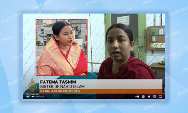 প্রতিবেদনটিতে ফাতেমা তাসনিম রাজধানীর গণস্বাস্থ্য নগর হাসপাতালে চিকিৎসাধীন নাহিদ ইসলামসহ তিন সমন্বয়ককে তুলে নিয়ে যাওয়ার ব্যাপারে আলজাজিরায় কথা বলেন। প্রতিবেদনে তাকে নাহিদের বোন হিসেবে পরিচয় করিয়ে দেওয়া হয়েছে।