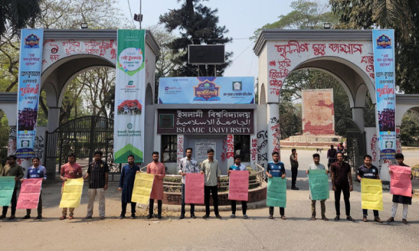 রবিবার (৯ মার্চ) দুপুরে বিশ্ববিদ্যালয়ের প্রধান ফটকে আইন অনুষদের শিক্ষার্থী ও শিক্ষানবিশ আইনজীবী ব্যানারে তারা এ মানববন্ধন করেন।
