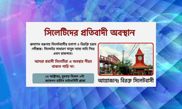 আজ বুধবার (১৫ অক্টোবর) যুক্তরাষ্ট্রের স্থানীয় সময় তিনটায় নিউইয়র্কের জ্যাকসন হাইটসের ডাইভার্সিটি প্লাজায় এক প্রতিবাদী অবস্থান কর্মসূচির ডাক দিয়েছে ‘বিরক্ত সিলেটবাসী’ নামে সেখানকার একটি সংগঠন।