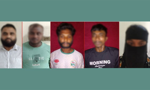 আটককৃতরা হলেন- রুকুব উদ্দিন (৩০), ইমরানা বেগম (২০), মোস্তফা আহমদ (৩৮), আবু হানিফ (২৮) ও সাইদুল ইসলাম (২৫)।