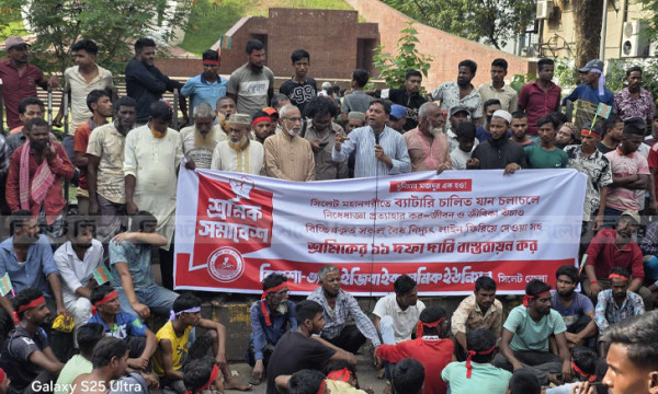 সিলেট নগরে ব্যাটারিচালিত রিকশা চলাচলের ওপর নিষেধাজ্ঞা প্রত্যাহারের দাবিতে সড়ক অবরোধ করে বিক্ষোভ করেছেন রিকশা শ্রমিকরা।